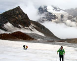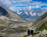 An early start today, as today is the day for a pass, as we make our way into Spiti. Leaving camp trek across the huge ice and snowfield leading to the pass. We need to negotiate the crevasses and icy slopes on glaciers. Following the guide's trail and footprints we continue making our way to the pass which will take us 3-4 hours to reach the Pin Parvati pass ( 5300 m / 17400 ft). The last part is a bit of a steep climb on a rocky ridge. As the sun moves on, the ice becomes unstable, and hence it's harder to walk to snow. So early starts are recommended when the snow and ice remain hard. Reaching the top before noon also gives a clear sky, as afternoon the clouds from valley starts of appears so the view starts to disappear. The pass offers a wide panorama of peaks and the valley of Spiti. We descend gradually from the pass-first on snow and ice, then steep descent on loose scree. Reaching the foot of the pass, we cross an ice-cold stream and reach the camp at Pin side base camp (4400m ) 14450 ft) on a patch of grass on the left bank of the Pin river.