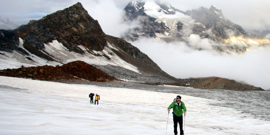 Today is a long and strenuous day, as we have 800 meters to gain in height. We make an early start from the camp and trek along the valley after crossing muddy parts with large sections of loose scree & small streams. We keep left as we climb a steep and steady ridge and the long and hard ascend starts. Trek is now through boulder and scree out of the main valley. The trail crosses a series of rocky terrain before a further steep climb leads to the base of Pin Parvati pass. Our final climb on a rocky ridge takes us to the beginning of the glacier. It is the edge of Parvati glacier. We camp at the edge of the glacier to us a base camp Parvati side (4940 m / 16207 ft). The spectacular view of Parvati South and Pyramid peak can be seen towards west from the base camp.